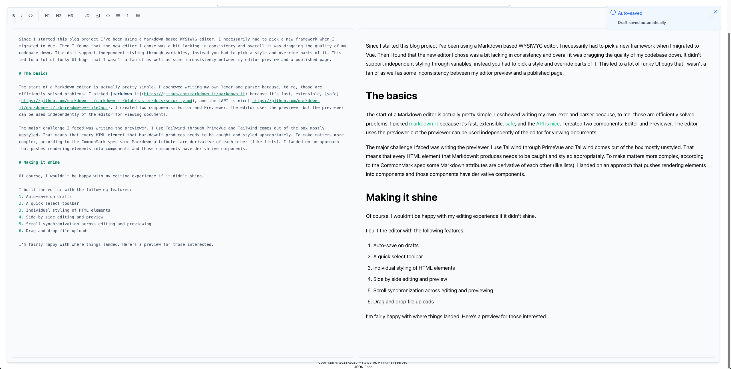 Since I started this blog project I've been using a Markdown based WYSIWYG editor. I necessarily had to pick a new framework when I migrated to Vue. Then I found that the new editor I chose was a bit lacking in consistency and overall it was dragging the quality of my codebase down. It didn't support independent styling through variables, instead you had to pick a style and override parts of it. This led to a lot of funky UI bugs that I wasn't a fan of as well as some inconsistency between my editor preview and a published page.