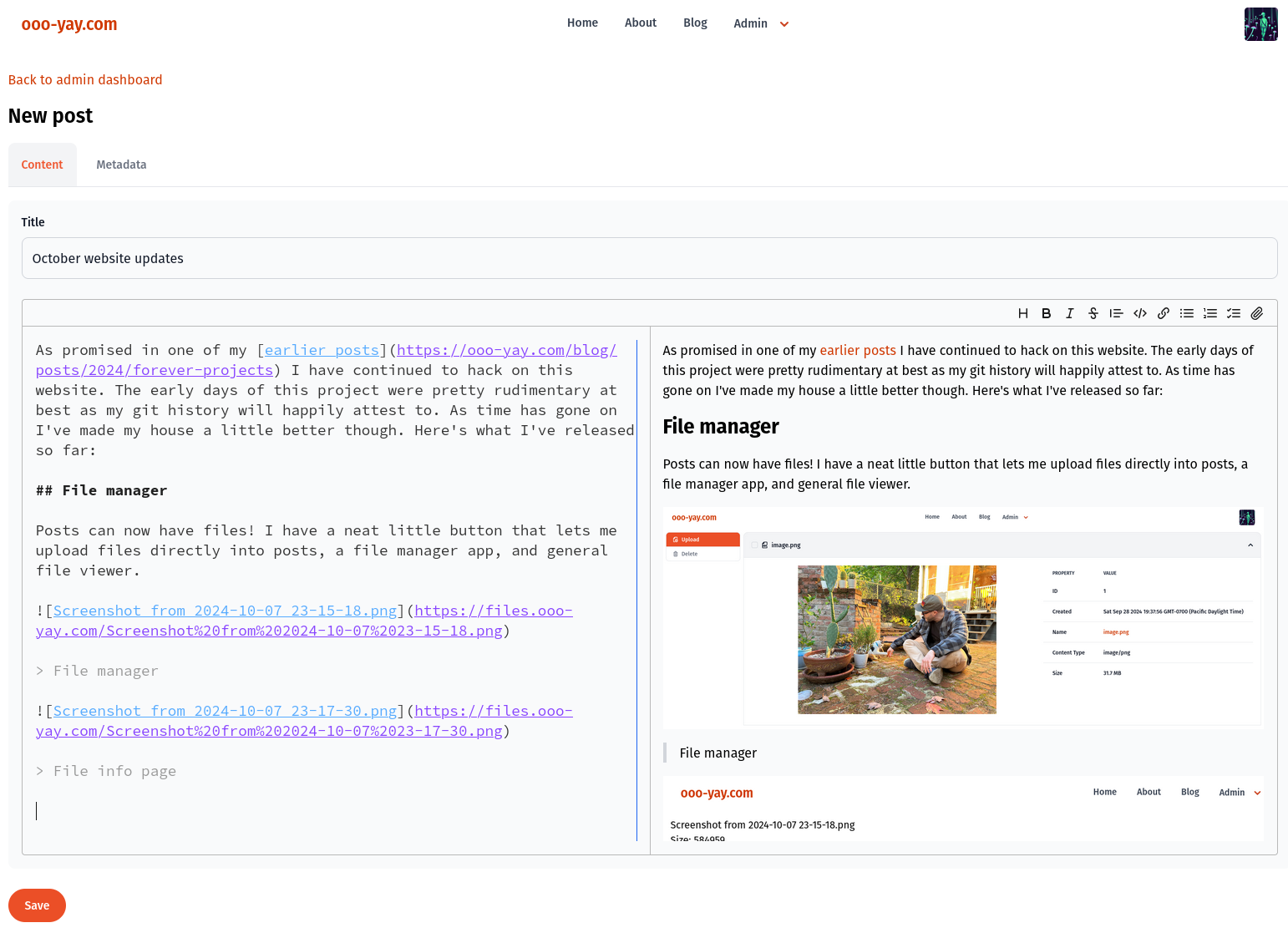 Posts can now have files! I have a neat little button that lets me upload files directly into posts, a file manager app, and general file viewer.