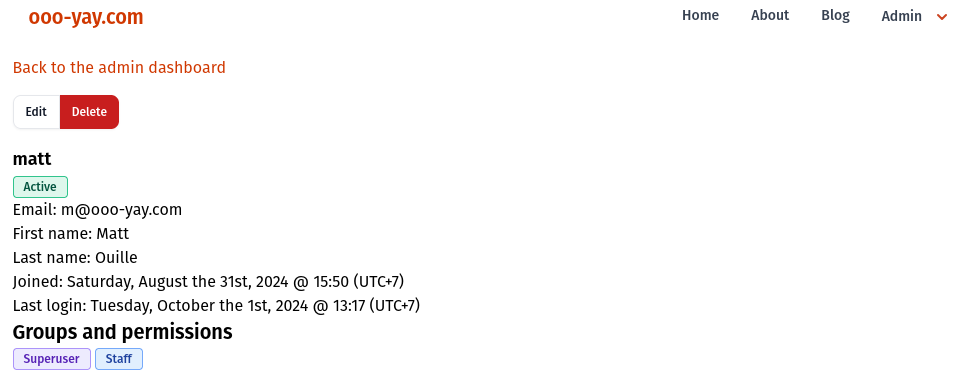 As you can see, the permissions model on my website is pretty simple at the moment. You're either totally in charge or not at all. For the most part this will remain the same.