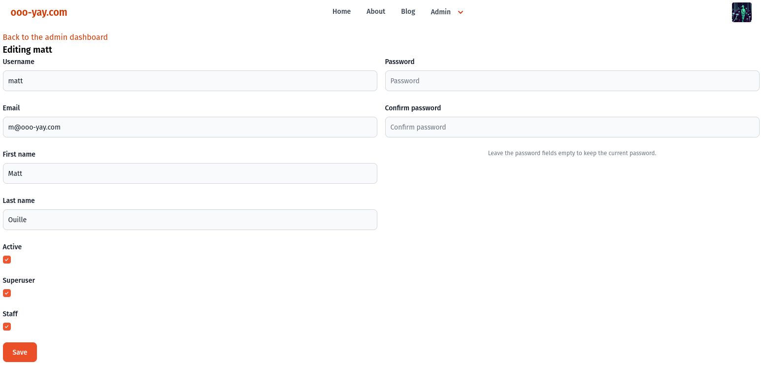 Since I opened up sign ups I needed a way to manage users. I ended up creating a view on my main admin dashboard that shows me user signups, a view for editing users, and a view for modifying users.
